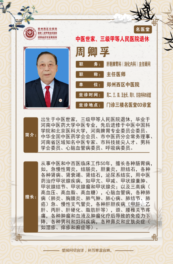 毕业于河南中医学院中医学专业,出生于中医世家,从事中医和中西医临床工作46年余,为市科技拔尖人才,中华全国中医药学会会员,市中医药分会常务理事,中医男科分会委员。