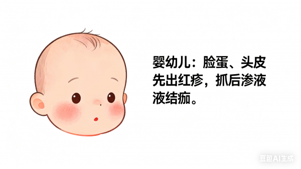 - 婴幼儿:脸蛋、头皮先出红疹,抓后渗液结痂,常哭闹。