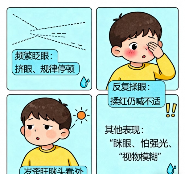 - 其他异常表现:比如看东西时不自觉眯眼、歪头,遇到强光会下意识闭眼,偶尔抱怨 “眼睛痒”“眼睛里有东西”,部分孩子还可能出现轻微的视力波动,比如看远处物体时短暂模糊。
