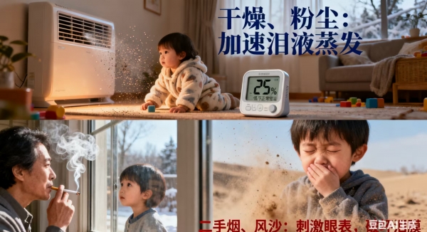 干燥的环境会加速泪液蒸发,比如冬季长时间开空调、暖气,夏季频繁使用空调,都会导致室内空气湿度降低(正常适宜湿度为 40%-60%,低于 30% 时泪液蒸发会明显加快);此外,长期处于烟雾环境(如家长吸烟)、风沙较多的户外,或长时间待在有粉尘的室内(如未及时清洁的毛绒玩具、地毯),也会刺激眼球表面,破坏泪膜稳定性,诱发干眼症。