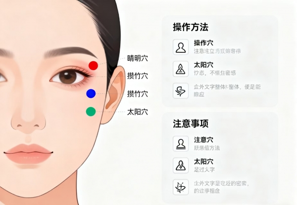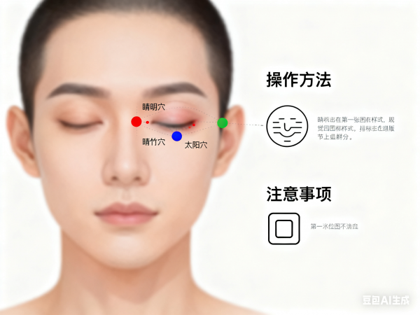 - 睛明穴:位于内眼角上方凹陷处,用拇指指腹轻轻按揉,每次 1-2 分钟,力度以感到酸胀为宜,可改善眼部血液循环,缓解眼干、眼涩。