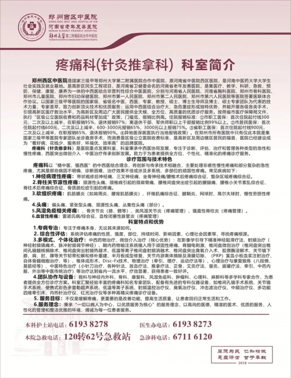 活动地址:郑州西区中医院门诊四楼疼痛科门诊 活动时间:2025年10月20日-10月26日 咨询电话:0371-86123168