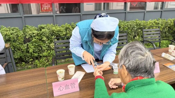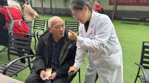 “大爷,您血压有点高,药按时吃了吗?”“奶奶,这个动作每天做十次,对肩膀好。”关切的声音在活动现场此起彼伏。护士们一边熟练地测量血糖血压,一边轻声叮嘱注意事项。银发老人们在医护人员搀扶下逐个检查,皱纹里漾开笑意。
