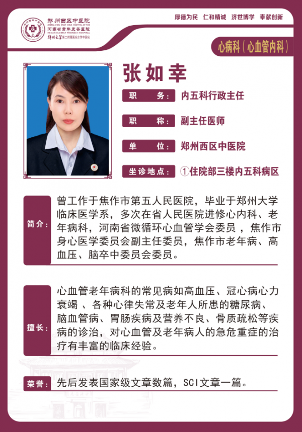 科室地址:郑州西区中医院2号楼住院部3楼内五科(心血管内科)
