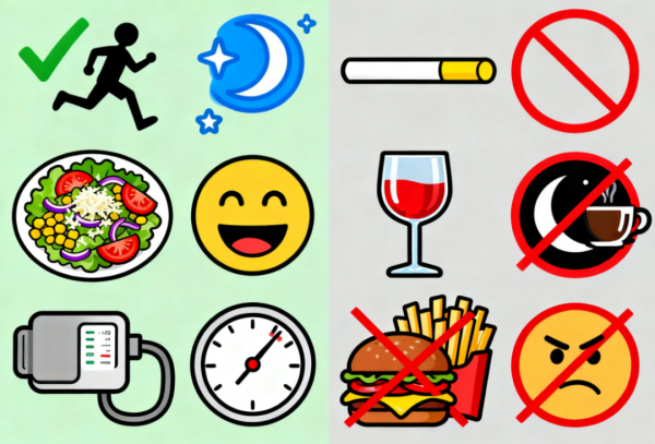 健康生活:戒烟限酒,规律作息,坚持每周150分钟以上中等强度运动(如快走、游泳),均衡饮食,减少高盐、高脂、高糖食物摄入。