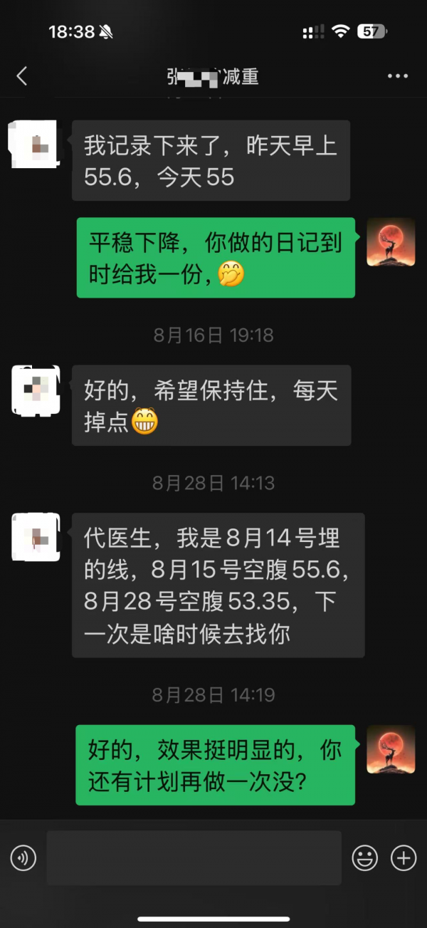 埋线后,她的体重稳步下降:8月15日空腹体重55.6公斤,8月28日已降至53.35公斤。不到一个月,体重下降近3公斤,效果显著。