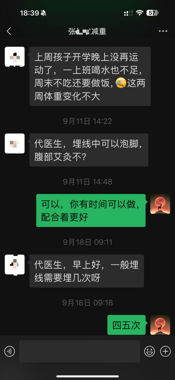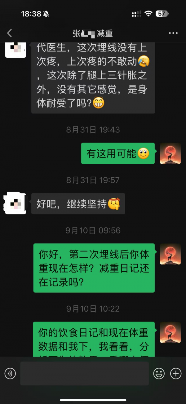 8月31日,张女士进行了第二次埋线。她反馈:“这次没有上次疼,除了腿上三针有点感觉之外,没有其它不适,是身体耐受了吗?”