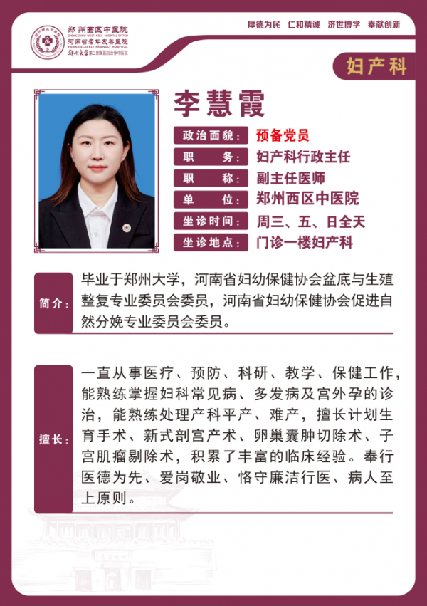 毕业于郑州大学,河南省妇幼保健协会盆底与生殖整复专业委员会委员,河南省妇幼保健协会促进自然分娩专业委员会委员。