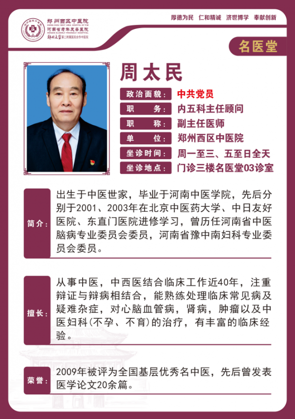 出生于中医世家,毕业于河南中医学院,曾历任河南省中医脑病专业委员会委员,河南省豫中南妇科专业委员会委员。