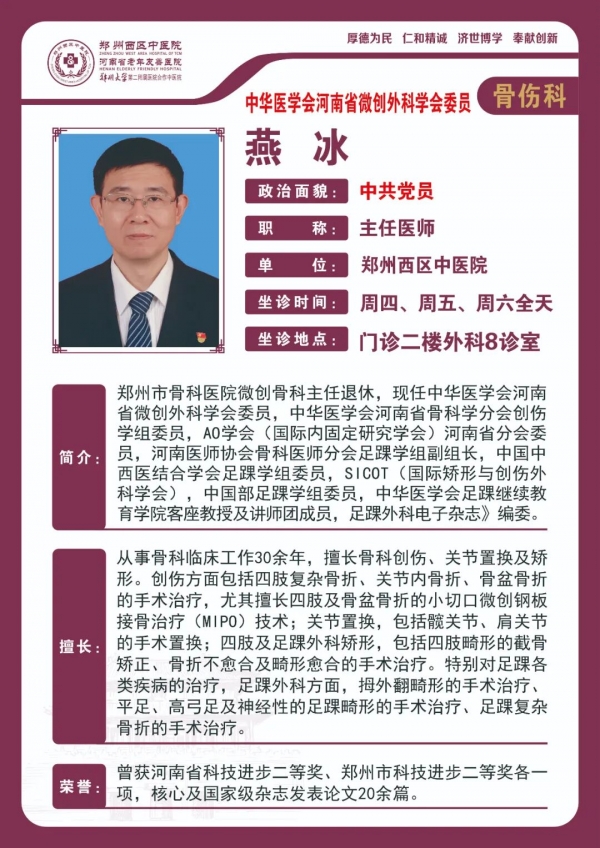 郑州市骨科医院微创骨科主任退休,现任中华医学会河南省微创外科学会委员,中华医学会河南省骨科学分会创伤学组委员,A0学会(国际内固定研究学会)河南省分会委员,河南医师协会骨科医师分会足踝学组副组长,中国中西医结合学会足踝学组委员,SIC0T(国际矫形与创伤外科学会),中国部足踝学组委员,中华医学会足踝继续教育学院客座教授及讲师团成员,足踝外科电子杂志》编委。