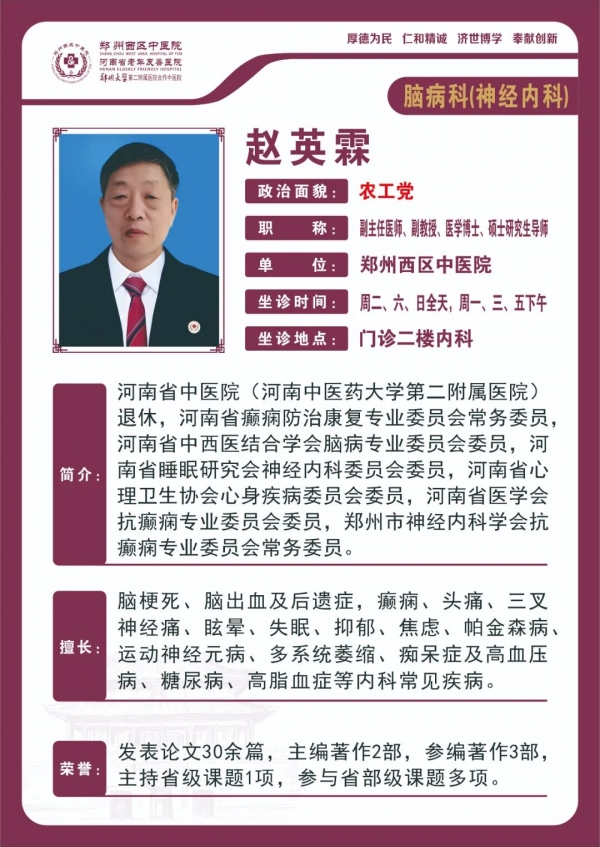 河南省中医院(河南中医药大学第二附属医院)退休,河南省癫痫防治康复专业委员会常务委员河南省中西医结合学会脑病专业委员会委员,河南省睡眠研究会神经内科委员会委员,河南省心理卫生协会心身疾病委员会委员,河南省医学会抗癫痫专业委员会委员,郑州市神经内科学会抗癫痫专业委员会常务委员。