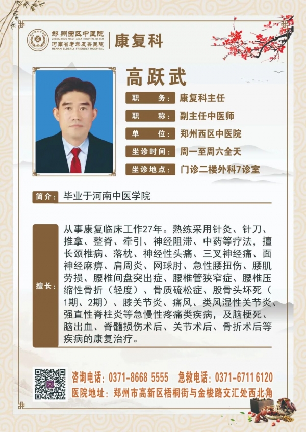 从事康复临床工作27年。熟练采用针灸、针刀、推拿、整脊、牵引、神经阻滞、中药等疗法,擅长颈椎病、落枕、神经性头痛、三叉神经痛、面神经麻痹、肩周炎、网球肘、急性腰扭伤、腰肌劳损、腰椎间盘突出症、腰椎管狭窄症、腰椎压缩性骨折(轻度)、骨质疏松症、股骨头坏死(1期、2期)、膝关节炎、痛风、类风湿性关节炎强直性脊柱炎等急慢性疼痛类疾病,及脑梗死、脑出血、脊髓损伤术后、关节术后、骨折术后等疾病的康复治疗。