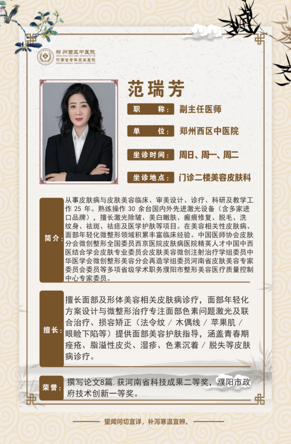 从事皮肤病与皮肤美容临床、审美设计、诊疗、科研及教学工作 25 年。熟练操作 30 余台国内外先进激光设备(含多家进口品牌),擅长激光除皱、美白嫩肤、瘢痕修复、脱毛、洗纹身、祛斑、祛痣及医学护肤等项目。在美容相关性皮肤病、面部年轻化微整形领域积累丰富临床经验。中国医师协会皮肤分会微创整形全国委员西京医院皮肤病医院精英人才中国中西医结合学会皮肤专业委员会皮肤美容微创注射治疗学组委员中华医学会微创整形美容分会再造学组委员河南省皮肤美容专家委员会委员等多项省级学术职务濮阳市整形美容医疗质量控制中心专家委员。