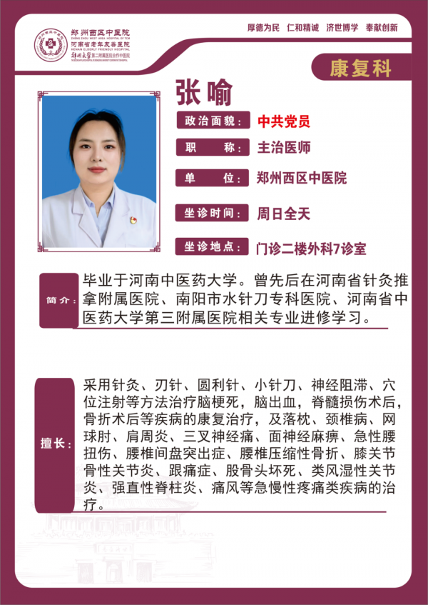 61 浏览在郑州西区中医院11楼,有一片“富含温度”的康复天地——宽敞明亮的康复大厅、设备齐全的针灸理疗室,以及一支由中医骨伤副高、中医内科主治、执业医师、护士和康复技师组成的专业团队。这就是我院重点发展的康复医学科。
