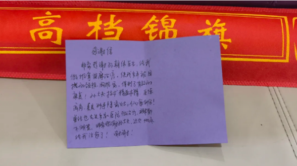 “真的太感谢孙大夫了!是您精心的推拿治疗让我终于摆脱了这2年多的痛苦折磨!”在送锦旗和感谢信时,田女士紧紧握着孙大夫的手,喜悦和感激之情溢于言表。她特意手写的感谢信中,字里行间都流露着对孙大夫高超医术的认可和对科室优质服务的赞赏。