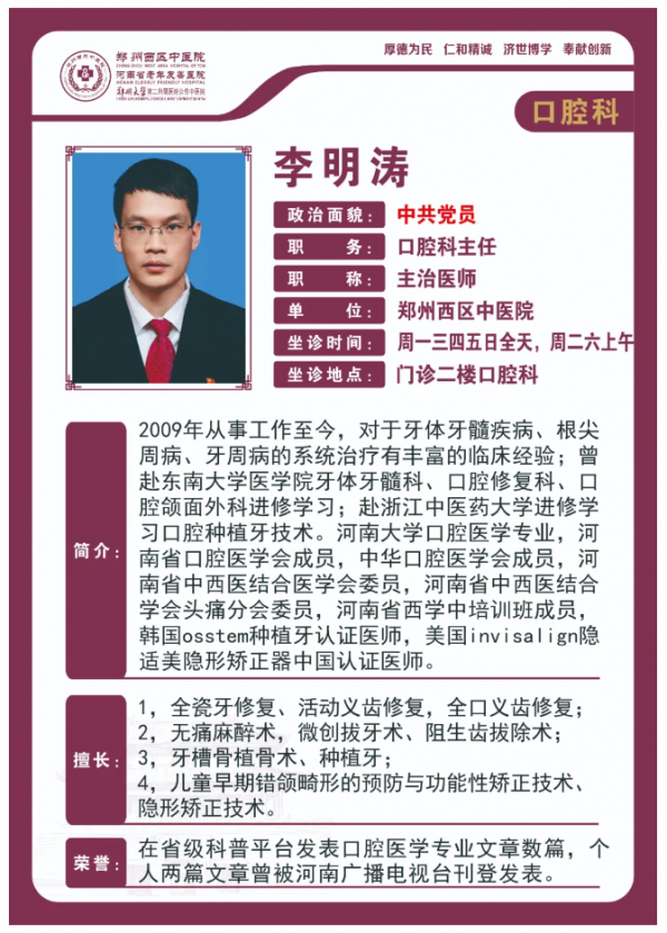 【高新区口腔科名医推荐】郑州西区中医院主治医师——李明涛。