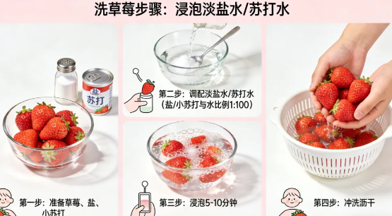 用淡苏打水、蔬果清洗剂或淡盐水浸泡5分钟左右;