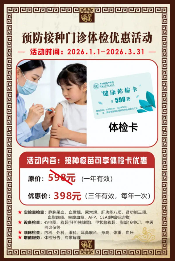 凡在门诊接种疫苗者,原价598元的体检卡,现仅需398元。这不是单次体验卡,而是三年有效、每年可全面体检一次的长效福利。