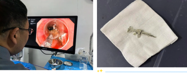 情况紧急!刘占力主任立即联系内镜中心主任张俊伟进行会诊。虽然孩子目前没有明显症状,但尖锐的异物滞留在肠道内,随时可能导致肠壁损伤、出血,甚至穿孔等严重后果。在内镜中心的精心操作下,手术非常顺利,玩具手枪被成功取出。术后孩子情绪稳定,孩子的父亲和奶奶激动地连声道谢。