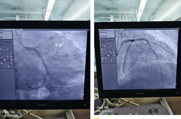 我院在院前接诊阶段便已启动急诊绿色通道,依托胸痛中心快速响应机制,待患者生命体征稍稳后,各相关科室高效联动,无缝衔接急诊抢救室与导管室,快速护送患者接受急诊血管介入治疗。内五科团队精准研判、娴熟操作,迅速开通堵塞血管、恢复心肌供血,牢牢把握救治关键时机。
