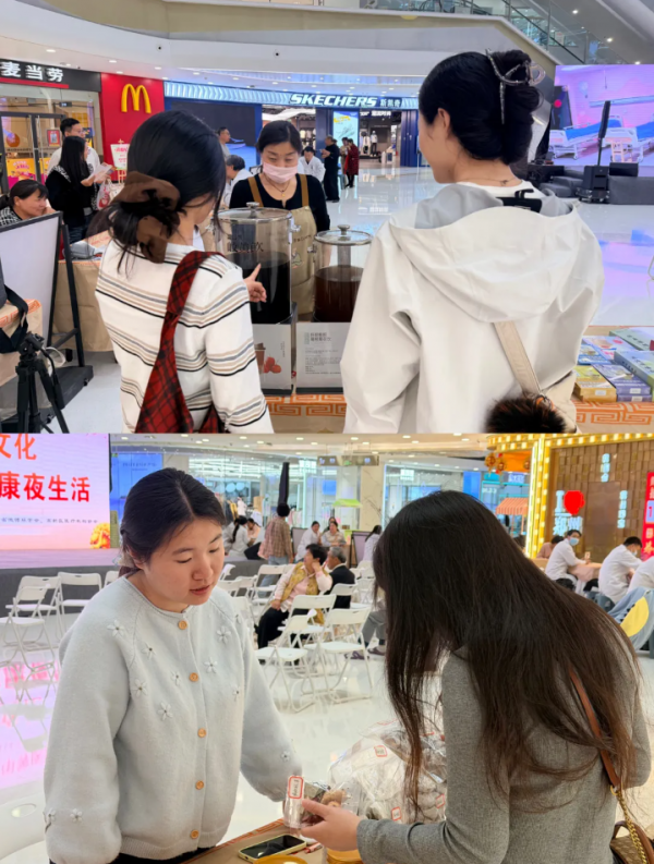 四季养生茶饮免费派送。不少年轻人手捧一杯暖暖的养生茶,边喝边逛。有人觉得味道不错,一连喝了好几杯,直呼:“比奶茶还上头!”