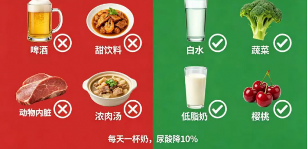 · 三多:多喝白水、多吃新鲜蔬菜、多喝低脂奶(每天一杯奶,尿酸降10%)。